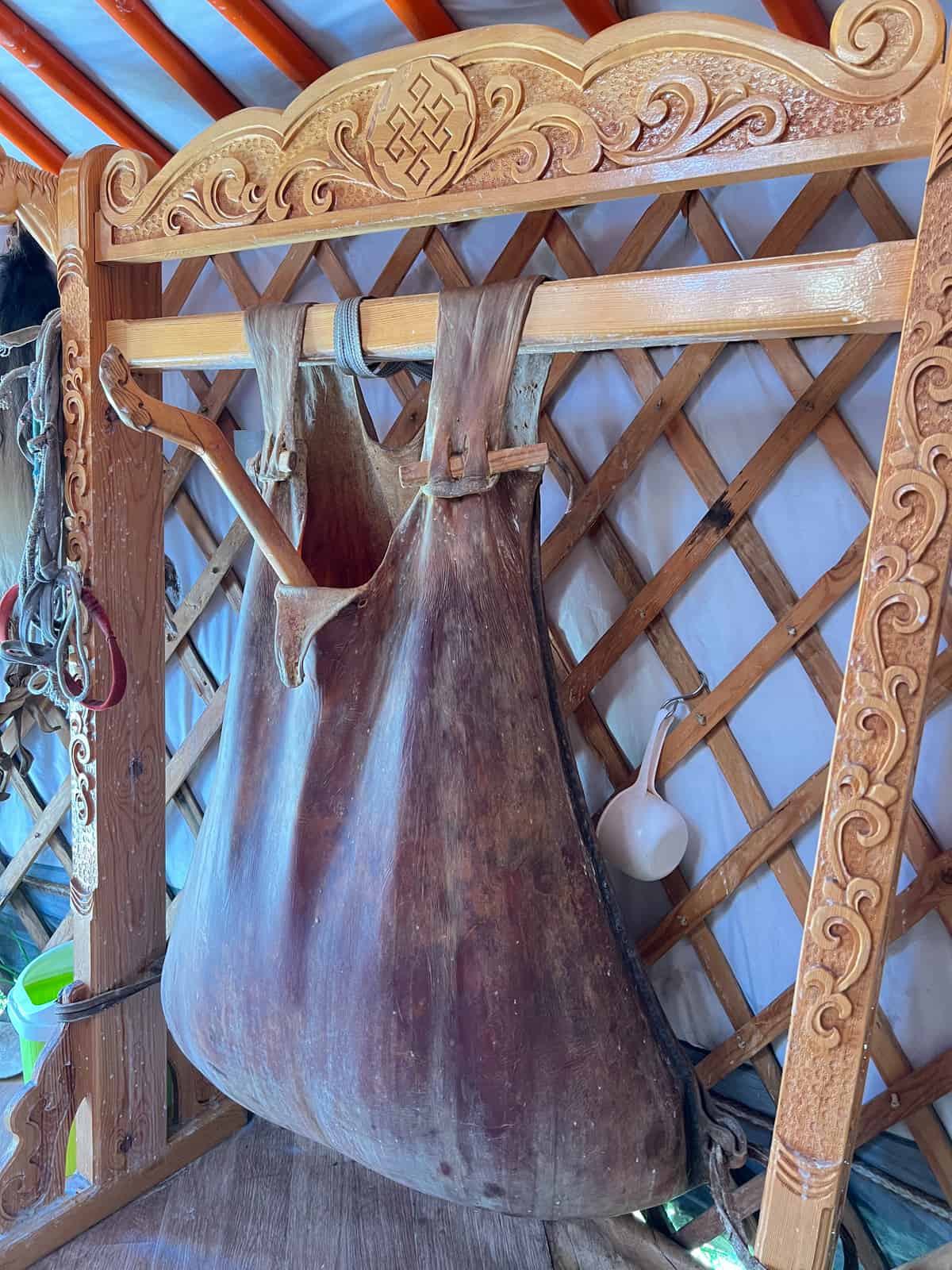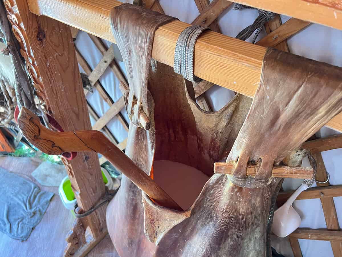 これは馬乳酒と呼ばれるお酒で、何かの皮に大量に入れられていました。